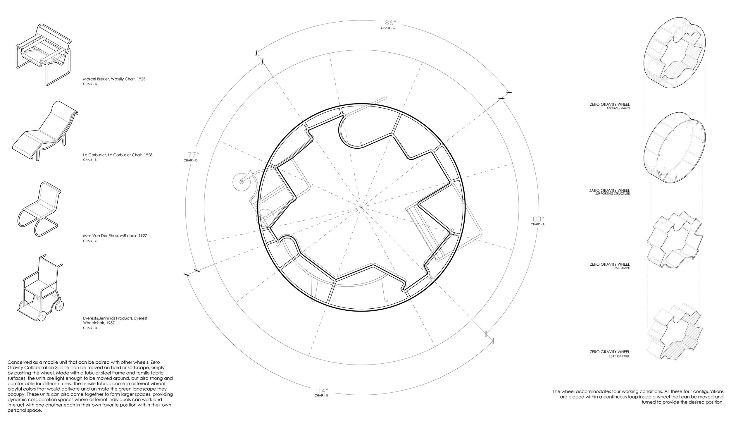 ZERO.GRAVITY is not a chair, but an amalgam of four iconic tubular steel chairs traced along a continuous loop: Marcel Breuer’s Wassily Chair, Mies van der Rohe’s MR Chair, Le Corbusier and Charlotte Perriand’s LC4 Chaise longue, and Herbert Everest and Henry Jennings’ first Folding Wheel Chair. The continuous tubular steel frame scaffolds the body, but also forms the outline of a much larger tube that now cradles it. Users can sit on any of the four prescribed chairs simply by rolling the piece on the ground, or appropriate the interstitial areas to find their own comfort zones, to take new positions, and to adopt unscripted postures.